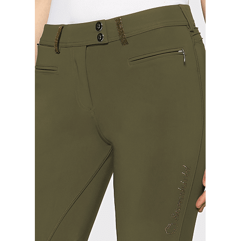 Die Reithose Adèle bietet Reitern Komfort und technische Leistung. Das taillierte Design, die Verwendung von strapazierfähigem Stoff mit viel Stretch und die Falten auf dem Rücken sorgen für eine perfekte Passform der Reiterin. Die Reithose Adèle bietet einen Second-Skin-Effekt für optimalen Komfort. Das elastische Gewebe garantiert hohe Atmungsaktivität und Windschutz. Der Silikon-Kniegriff sorgt für Stabilität und Halt im Sattel. Der Kompressionsstoff sorgt für einen perfekten Sitz der Reithose. Das elastische Band auf der Innenseite des Gürtels ist mit Silikon ausgestattet, das ein Hochrutschen des Hemdes verhindert. Dank der speziellen Konstruktion des Gewebes bietet die Reithose Adèle Schutz vor ultravioletten Strahlen. Die Reithose ist mit einem Swarovski® Samshield-Logo auf dem Oberschenkel des Reiters und mit Crystal Fabric Swarovski® auf den Gesäßtaschen verziert und vereint technische Leistung und Eleganz.