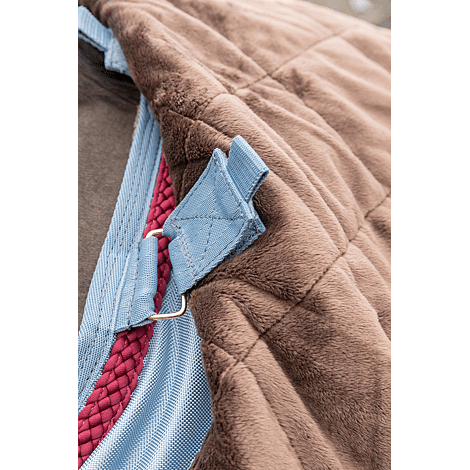 Het halsdeel All Weather 150g kan gebruikt worden in combinatie met de Kentucky deken All Weather Pro. De buitenstof is gemaakt van 1680 Denier High Tenacity Polyester waardoor het nekgedeelte extreem sterk en duurzaam is. Dankzij de waterdichte en ademende PU coating is deze ademend, vuilafstotend en toch bestand tegen alle weersomstandigheden. Het nekgedeelte is volledig gevoerd met artificieel konijnenvacht (100% diervriendelijk). Dit zorgt voor extra warmte aangezien het kleine luchtbelletjes creëert dat de lichaamswarmte van het paard vasthouden. Ook geeft het een extreem comfortabel gevoel en doet de vacht van je paard glanzen. Het voorkomt schuren van de manen. Zelfs de rand achter de oren is voorzien van artificieel konijnenvacht. Het Nekgedeelte wordt vastgemaakt aan het deken met behulp van vier sterke klittenbandsluitingen en dichtgemaakt met twee sterke klittenbandsluitingen.